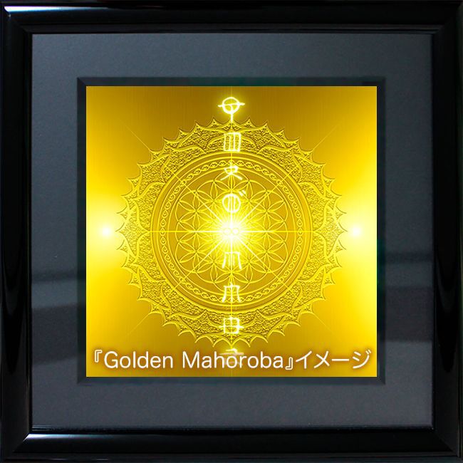 そのため、中央に表記してあるホツマ文字の呪文を絵画『黄金のマホロバ』とは異なる呪文にしてあります。